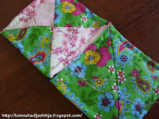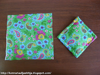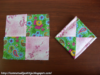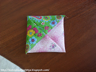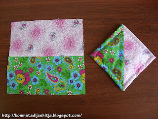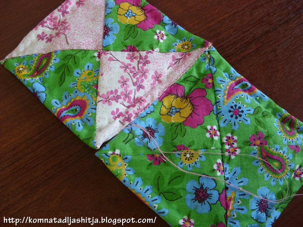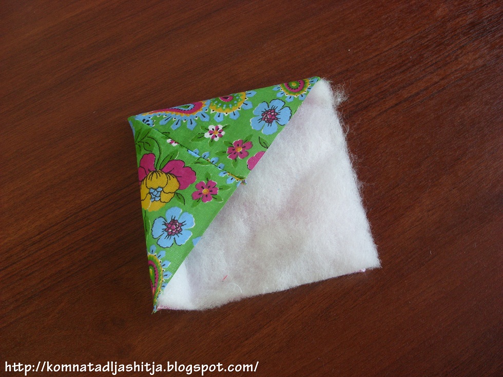 Складываем квадраты пополам и стачиваем боковые стороны. Получается "пилоточка", которую выворачиваем на лицевую сторону